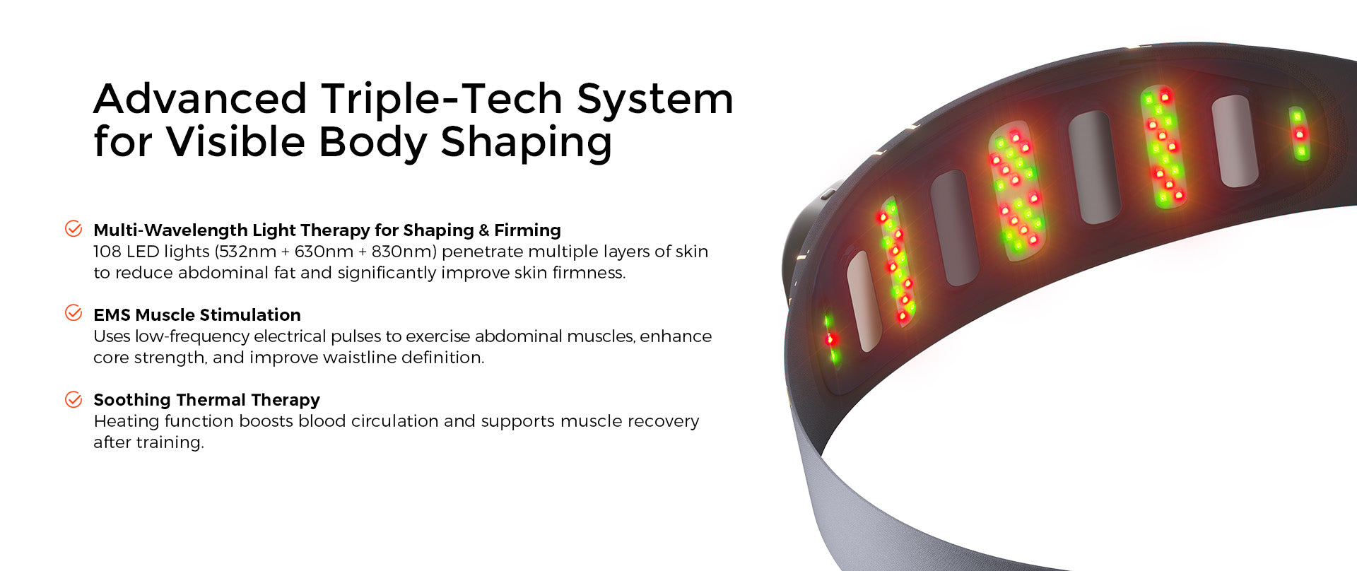 Multi-Wavelength Light Therapy for Shaping &Firming-108 LED lights (532nm+ 630nm+ 830nm) penetratemultiple layers of skin to reduce abdominal fat andsignificantly improve skin firmness.
